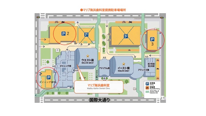 ①一番当院からのアクセスが良いのは幕張メッセ前にあるダイニング棟前パーキングという平置きの駐車場です。空きがあるようであればここに停めていただくことをお勧めします。